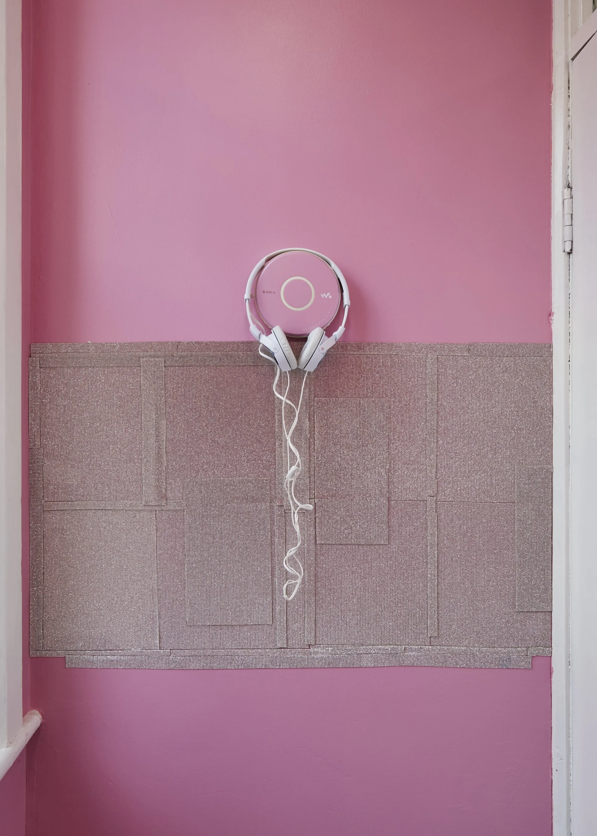 Bathroom: pink paint with diamanté gems, walkman with ‘kissing’ playlist created by Anya Gorkova