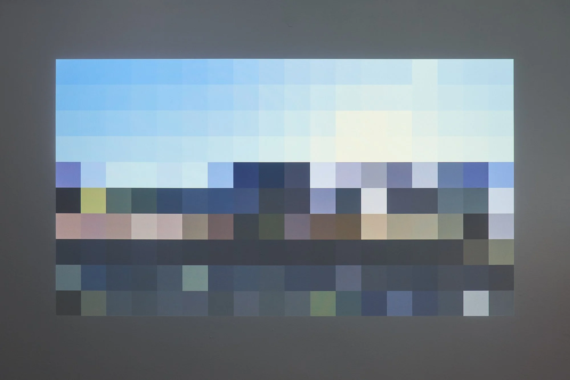The motif of the grid, which appears frequently in the artist’s work, also represents a pixelated screen, echoing the video "Landscape" (2024) projected in the gallery’s first room. Before undergoing digital processing, the images depicted a week-long of sunrises and sunsets captured during the time of production in the countryside. As viewers, one can attempt to unravel the once bucolic landscape within the grid or surrender to seeing it as vibrant abstract imagery — a portal to another place and time.