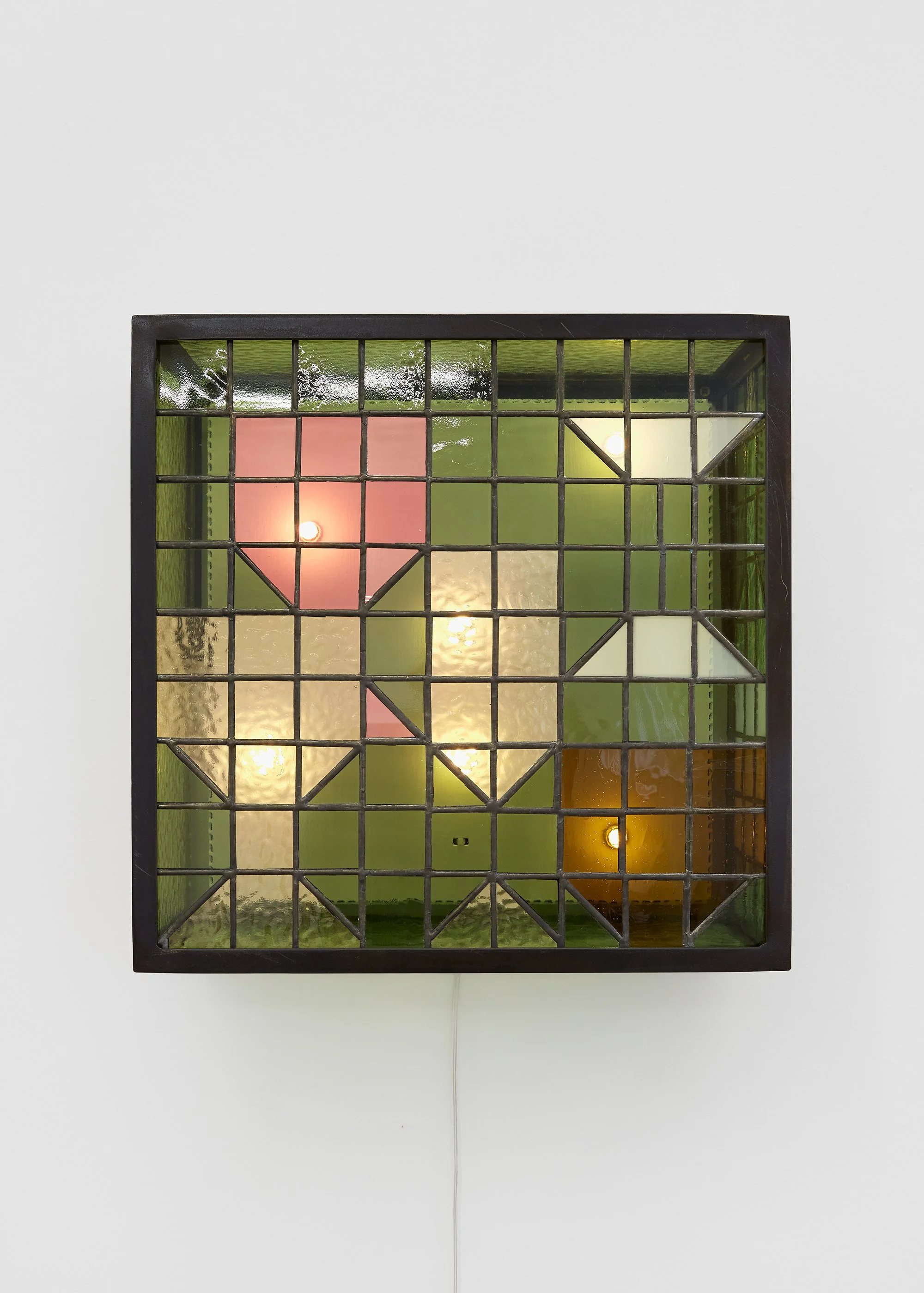 Georgina Hill, Drink cabinet, 2024. Stained glass, steel, LED bulbs, circuit board, electrical hardware, 40 (H) x 40 (W) x 20 (D) cm