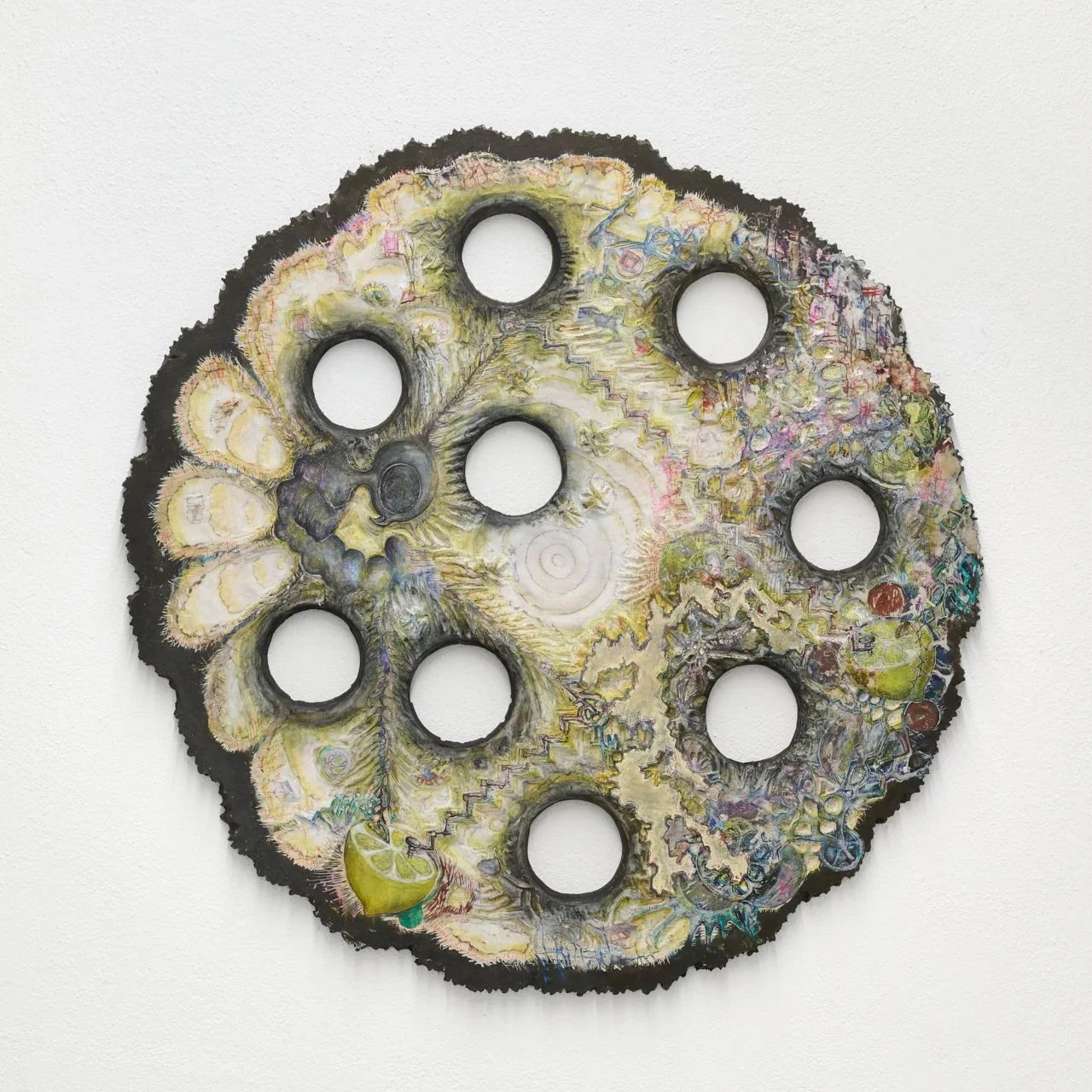 Tom Hardwick-Allan, ୧, 2022. Acrylic, ink, marker, fine-liner and biro on carved birch plywood, 107 (H) x 102 (W) x 2.4 (D) cm